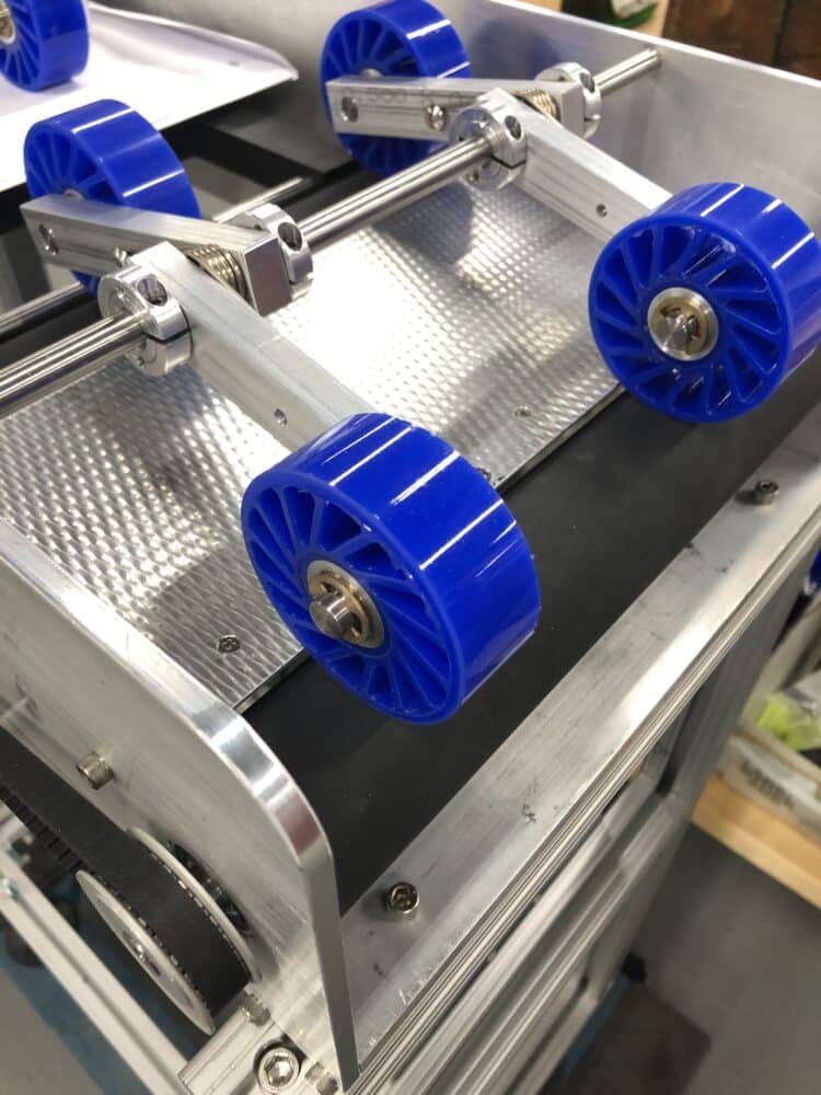 3. Other Machine Adjustments: For applications where there is a large amount of variance between the objects and materials coming in contact with a No-Crush Wheel, it is recommended that other areas allow for adjustment in position, beyond just relying on the “give” or compliance of a No-Crush Wheel. This can include hinged and spring loaded axles of rotation, machine screws or threaded rods, and other fixturing with adjustment opportunities.