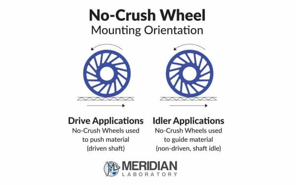 Applications in which material is being driven/fed by a No-Crush Wheel are mounted opposite from applications in which the No-Crush Wheel is idling. This is done so that the spokes of the Zero-Crush Wheels best allow for compression while they are coming in contact with the materials they are driving or idling.
