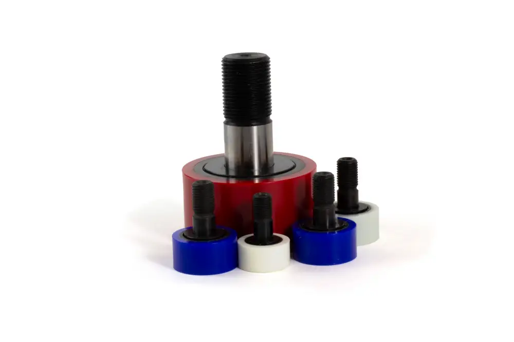 Polyurethane molded cam followers are used in a wide range of industrial and automation applications, typically where higher load bearing is required. They are available in a wide variety of different durometers, styles, sizes, and options.